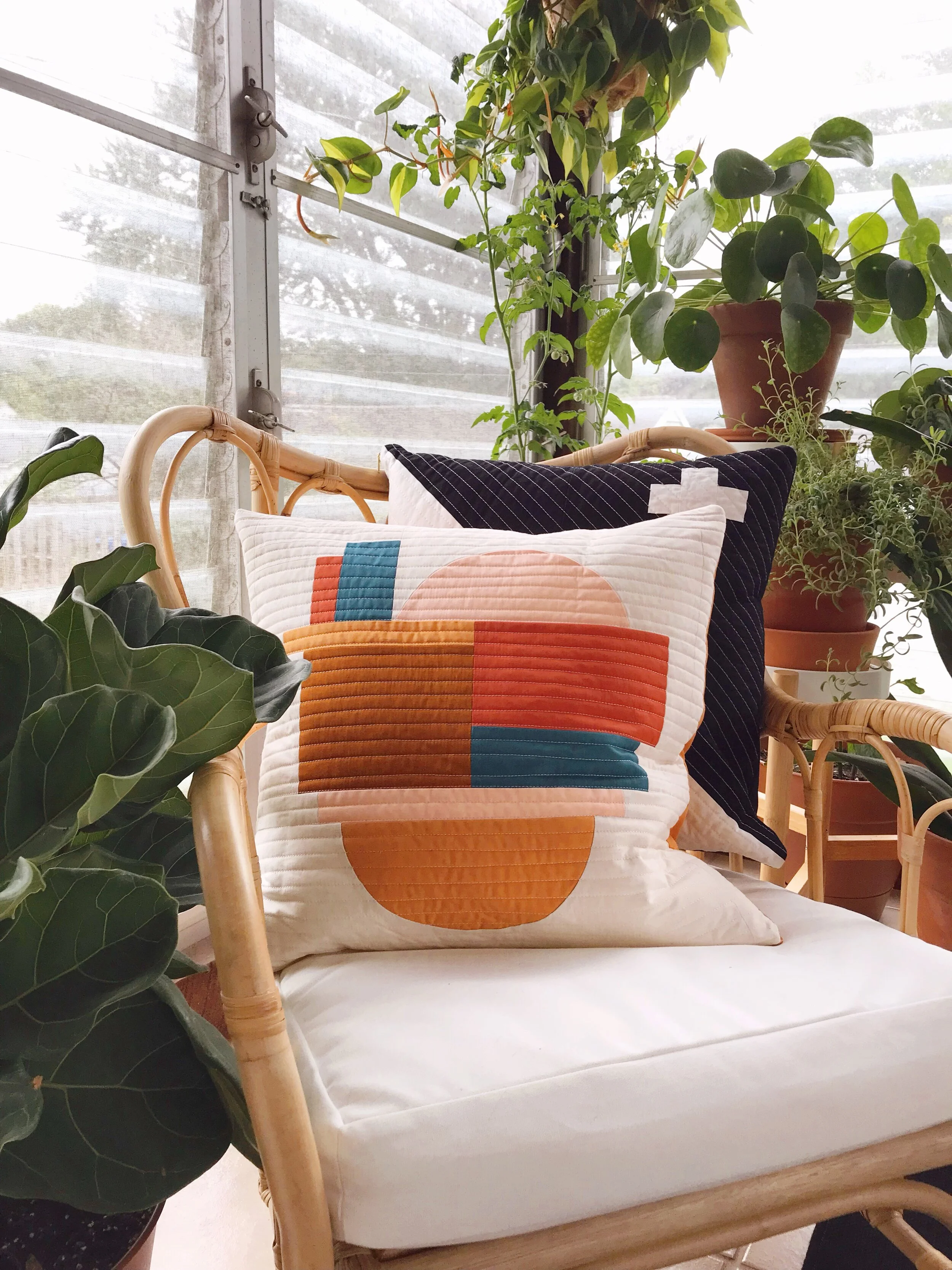 Arianna not surprisingly chose the Purifoy Wall Hanging, the most improv-inspired and least traditional pattern from the book. She selected a handful of her signature fabric colors to puzzle-piece together and instead of finishing it as a wall hanging, she turned it into a pillow for her new sunroom. I love the way Arianna made this project her own - it reflects her style and works in her space, but is still very much the Purifoy.